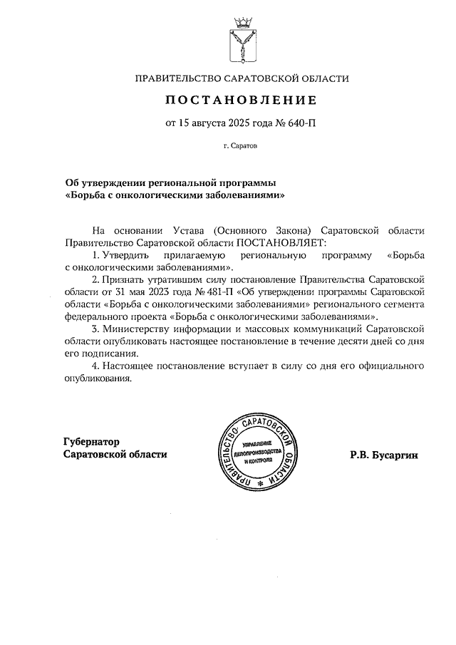 Постановление Правительства Саратовской области от 15.08.2025 N 640-П "Об утверждении региональной программы "Борьба с онкологическими заболеваниями"