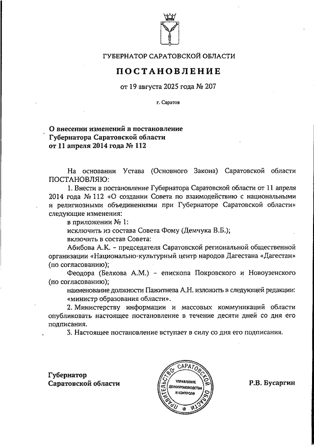 Постановление Губернатора Саратовской области от 19.08.2025 N 207 "О внесении изменений в постановление Губернатора Саратовской области от 11 апреля 2014 года N 112"