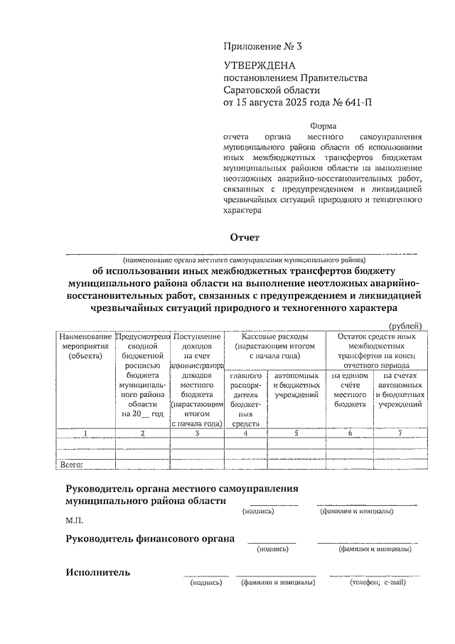 Постановление Правительства Саратовской области от 15.08.2025 N 641-П "О выделении средств из резервного фонда Правительства Саратовской области, методике распределения и правилах предоставления из областного бюджета иных межбюджетных трансфертов бюджетам муниципальных районов области на выполнение неотложных аварийно-восстановительных работ, связанных с предупреждением и ликвидацией чрезвычайных ситуаций природного и техногенного характера" (вместе с "Положением о методике распределения и правилах предоставления из областного бюджета иных межбюджетных трансфертов бюджетам муниципальных районов области на выполнение неотложных аварийно-восстановительных работ, связанных с предупреждением и ликвидацией чрезвычайных ситуаций природного и техногенного характера")