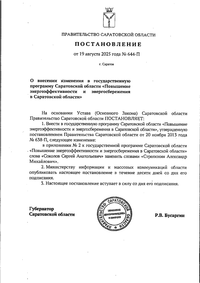 Постановление Правительства Саратовской области от 19.08.2025 N 644-П "О внесении изменения в государственную программу Саратовской области "Повышение энергоэффективности и энергосбережения в Саратовской области"