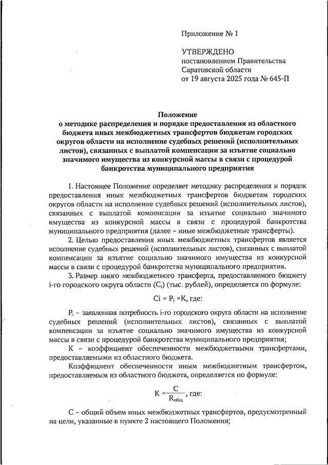 Постановление Правительства Саратовской области от 19.08.2025 N 645-П "О выделении средств из резервного фонда Правительства Саратовской области, методике распределения и порядке предоставления из областного бюджета иных межбюджетных трансфертов бюджетам городских округов области на исполнение судебных решений (исполнительных листов), связанных с выплатой компенсации за изъятие социально значимого имущества из конкурсной массы в связи с процедурой банкротства муниципального предприятия" (вместе с "Положением о методике распределения и порядке предоставления из областного бюджета иных межбюджетных трансфертов бюджетам городских округов области на исполнение судебных решений (исполнительных листов), связанных с выплатой компенсации за изъятие социально значимого имущества из конкурсной массы в связи с процедурой банкротства муниципального предприятия")