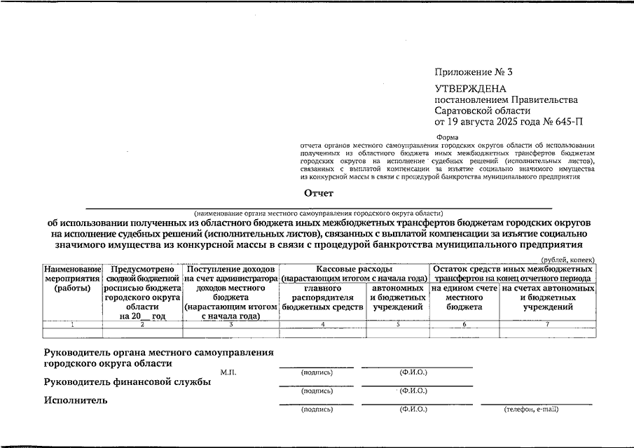 Постановление Правительства Саратовской области от 19.08.2025 N 645-П "О выделении средств из резервного фонда Правительства Саратовской области, методике распределения и порядке предоставления из областного бюджета иных межбюджетных трансфертов бюджетам городских округов области на исполнение судебных решений (исполнительных листов), связанных с выплатой компенсации за изъятие социально значимого имущества из конкурсной массы в связи с процедурой банкротства муниципального предприятия" (вместе с "Положением о методике распределения и порядке предоставления из областного бюджета иных межбюджетных трансфертов бюджетам городских округов области на исполнение судебных решений (исполнительных листов), связанных с выплатой компенсации за изъятие социально значимого имущества из конкурсной массы в связи с процедурой банкротства муниципального предприятия")