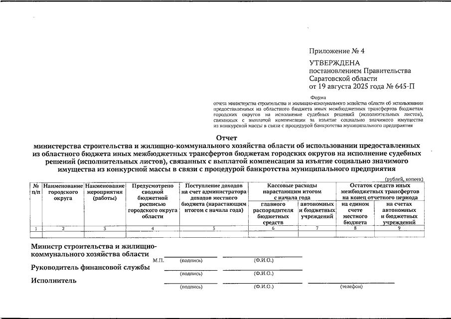 Постановление Правительства Саратовской области от 19.08.2025 N 645-П "О выделении средств из резервного фонда Правительства Саратовской области, методике распределения и порядке предоставления из областного бюджета иных межбюджетных трансфертов бюджетам городских округов области на исполнение судебных решений (исполнительных листов), связанных с выплатой компенсации за изъятие социально значимого имущества из конкурсной массы в связи с процедурой банкротства муниципального предприятия" (вместе с "Положением о методике распределения и порядке предоставления из областного бюджета иных межбюджетных трансфертов бюджетам городских округов области на исполнение судебных решений (исполнительных листов), связанных с выплатой компенсации за изъятие социально значимого имущества из конкурсной массы в связи с процедурой банкротства муниципального предприятия")