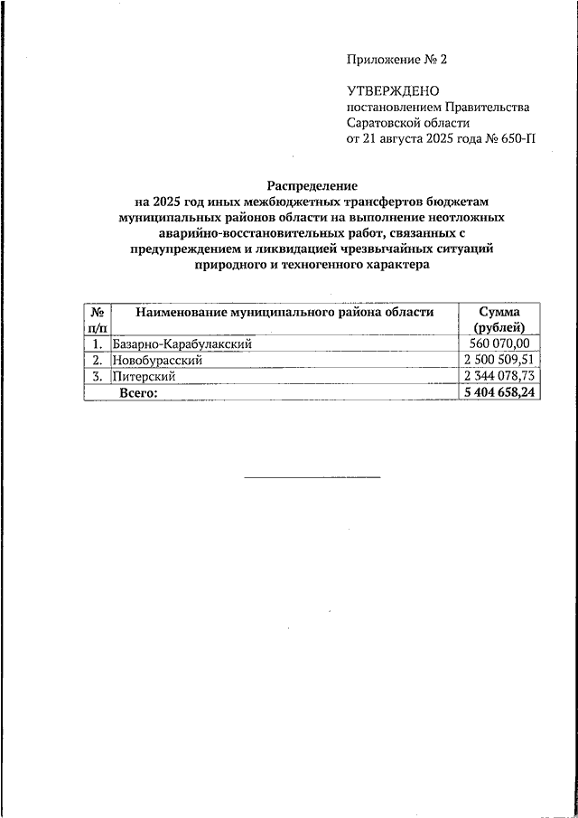 Постановление Правительства Саратовской области от 21.08.2025 N 650-П "О выделении средств из резервного фонда Правительства Саратовской области, методике распределения и правилах предоставления из областного бюджета иных межбюджетных трансфертов бюджетам муниципальных районов области на выполнение неотложных аварийно-восстановительных работ, связанных с предупреждением и ликвидацией чрезвычайных ситуаций природного и техногенного характера" (вместе с "Положением о методике распределения и правилах предоставления из областного бюджета иных межбюджетных трансфертов бюджетам муниципальных районов области на выполнение неотложных аварийно-восстановительных работ, связанных с предупреждением и ликвидацией чрезвычайных ситуаций природного и техногенного характера")