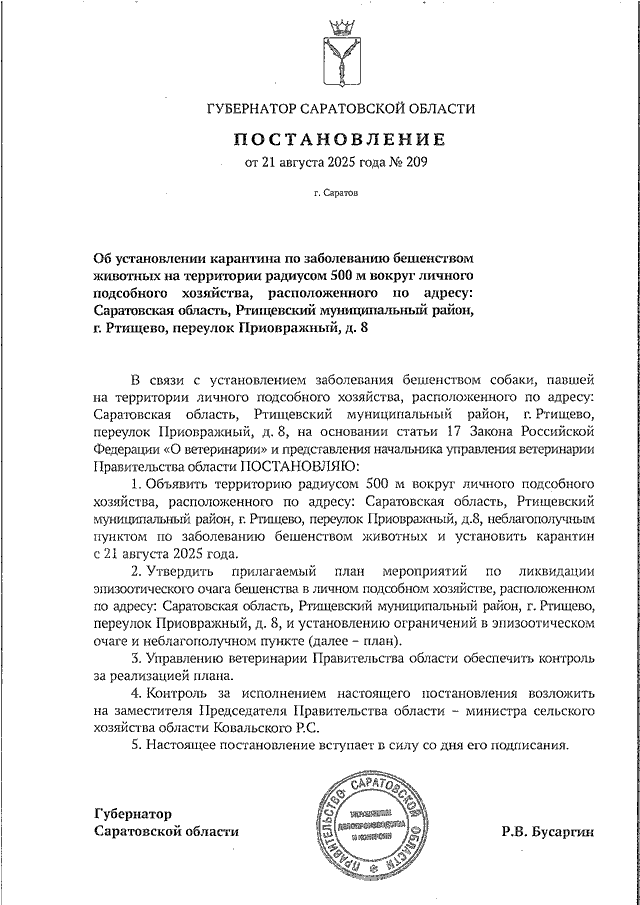 Постановление Губернатора Саратовской области от 21.08.2025 N 209 "Об установлении карантина по заболеванию бешенством животных на территории радиусом 500 м вокруг личного подсобного хозяйства, расположенного по адресу: Саратовская область, Ртищевский муниципальный район, г. Ртищево, переулок Приовражный, д. 8"