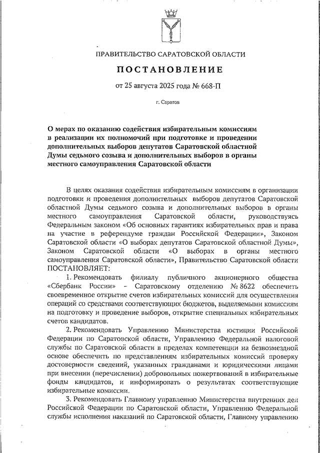 Постановление Правительства Саратовской области от 25.08.2025 N 668-П "О мерах по оказанию содействия избирательным комиссиям в реализации их полномочий при подготовке и проведении дополнительных выборов депутатов Саратовской областной Думы седьмого созыва и дополнительных выборов в органы местного самоуправления Саратовской области"