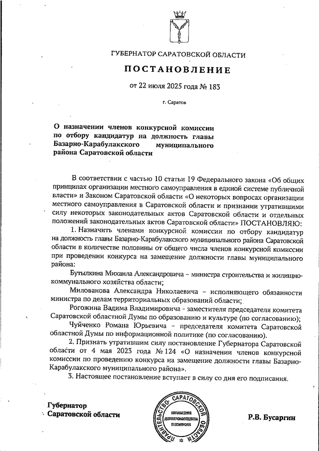 Постановление Губернатора Саратовской области от 22.07.2025 N 183 "О назначении членов конкурсной комиссии по отбору кандидатур на должность главы Базарно-Карабулакского муниципального района Саратовской области"