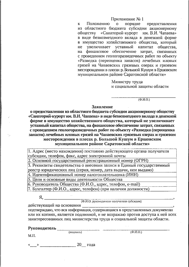 Постановление Правительства Саратовской области от 24.07.2025 N 573-П "Об утверждении Положения о порядке предоставления из областного бюджета субсидии акционерному обществу "Санаторий-курорт им. В.И. Чапаева" в виде безвозмездного вклада в денежной форме в имущество хозяйственного общества, который не увеличивает уставный капитал общества, на финансовое обеспечение затрат, связанных с проведением геологоразведочных работ по объекту "Разведка (переоценка запасов) лечебных иловых грязей на Чапаевских грязевых озерах и грязевом месторождении в плесах р. Большой Кушум в Ершовском муниципальном районе Саратовской области"