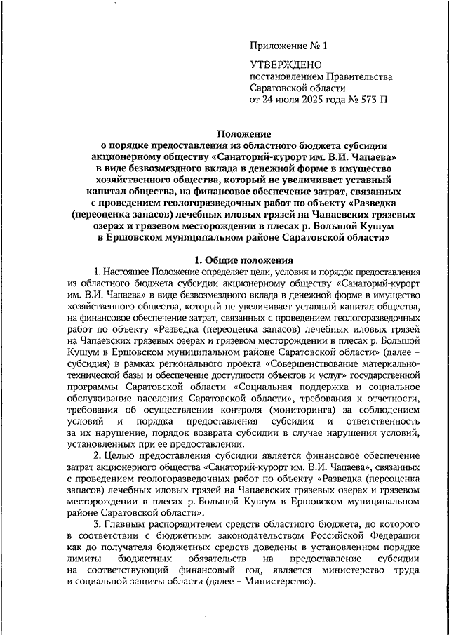 Постановление Правительства Саратовской области от 24.07.2025 N 573-П "Об утверждении Положения о порядке предоставления из областного бюджета субсидии акционерному обществу "Санаторий-курорт им. В.И. Чапаева" в виде безвозмездного вклада в денежной форме в имущество хозяйственного общества, который не увеличивает уставный капитал общества, на финансовое обеспечение затрат, связанных с проведением геологоразведочных работ по объекту "Разведка (переоценка запасов) лечебных иловых грязей на Чапаевских грязевых озерах и грязевом месторождении в плесах р. Большой Кушум в Ершовском муниципальном районе Саратовской области"