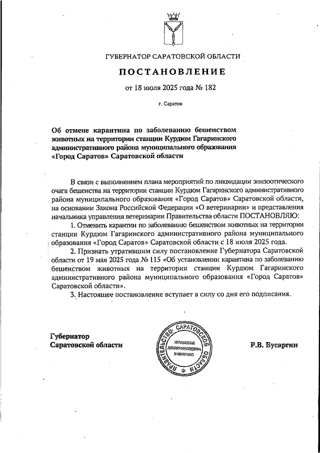Постановление Губернатора Саратовской области от 18.07.2025 N 182 "Об отмене карантина по заболеванию бешенством животных на территории станции Курдюм Гагаринского административного района муниципального образования "Город Саратов" Саратовской области"