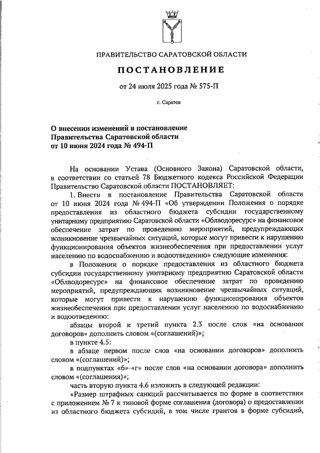 Постановление Правительства Саратовской области от 24.07.2025 N 575-П "О внесении изменений в постановление Правительства Саратовской области от 10 июня 2024 года N 494-П"