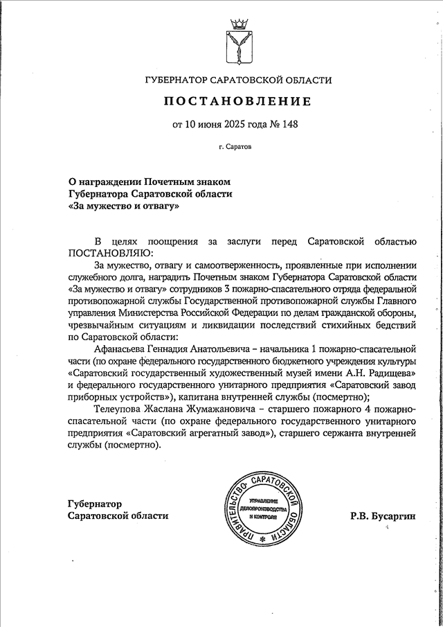 Постановление Губернатора Саратовской области от 10.06.2025 N 148 "О награждении Почетным знаком Губернатора Саратовской области "За мужество и отвагу"