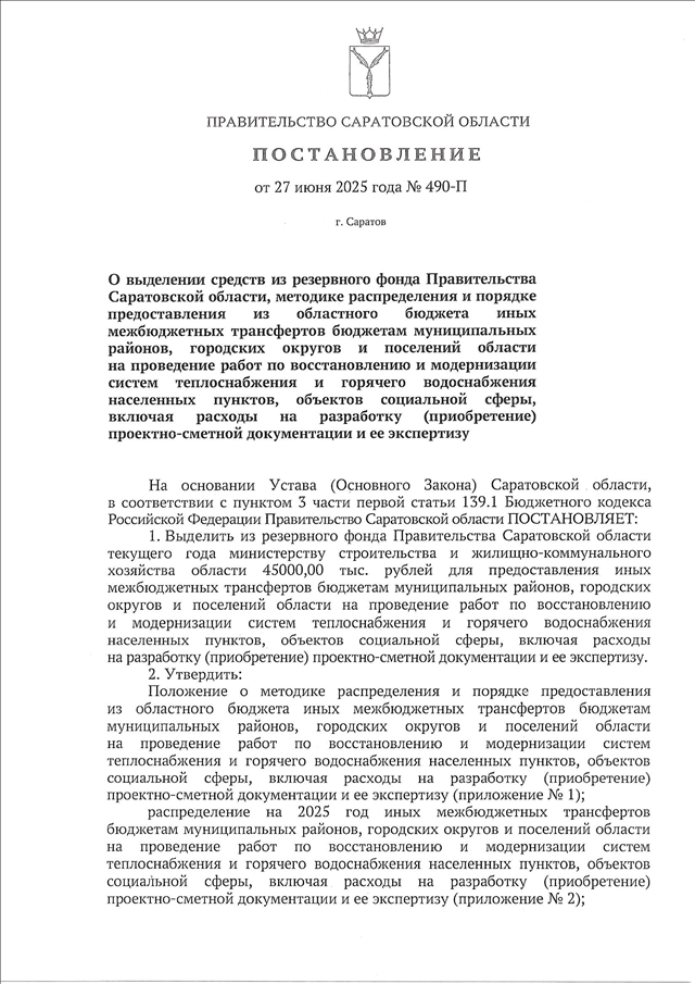Постановление Правительства Саратовской области от 27.06.2025 N 490-П "О выделении средств из резервного фонда Правительства Саратовской области, методике распределения и порядке предоставления из областного бюджета иных межбюджетных трансфертов бюджетам муниципальных районов, городских округов и поселений области на проведение работ по восстановлению и модернизации систем теплоснабжения и горячего водоснабжения населенных пунктов, объектов социальной сферы, включая расходы на разработку (приобретение) проектно-сметной документации и ее экспертизу" (вместе с "Положением о методике распределения и порядке предоставления из областного бюджета иных межбюджетных трансфертов бюджетам муниципальных районов, городских округов и поселений области на проведение работ по восстановлению и модернизации систем теплоснабжения и горячего водоснабжения населенных пунктов, объектов социальной сферы, включая расходы на разработку (приобретение) проектно-сметной документации и ее экспертизу")