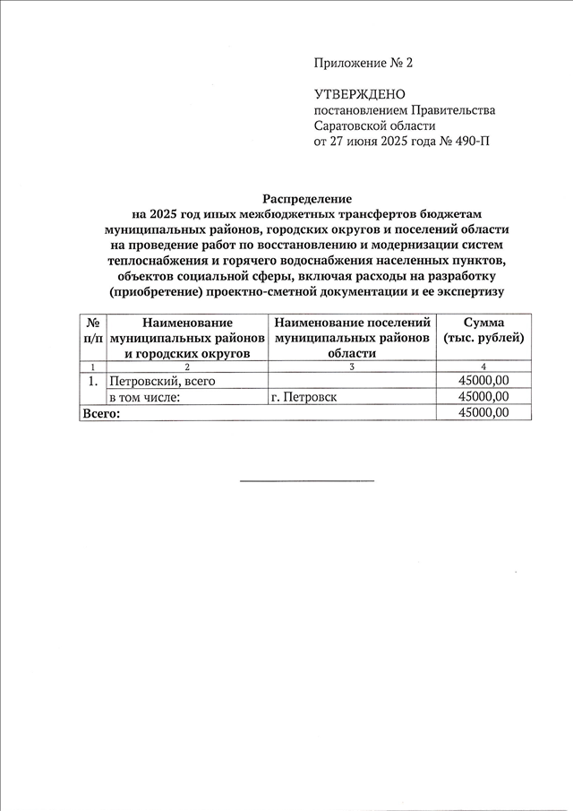 Постановление Правительства Саратовской области от 27.06.2025 N 490-П "О выделении средств из резервного фонда Правительства Саратовской области, методике распределения и порядке предоставления из областного бюджета иных межбюджетных трансфертов бюджетам муниципальных районов, городских округов и поселений области на проведение работ по восстановлению и модернизации систем теплоснабжения и горячего водоснабжения населенных пунктов, объектов социальной сферы, включая расходы на разработку (приобретение) проектно-сметной документации и ее экспертизу" (вместе с "Положением о методике распределения и порядке предоставления из областного бюджета иных межбюджетных трансфертов бюджетам муниципальных районов, городских округов и поселений области на проведение работ по восстановлению и модернизации систем теплоснабжения и горячего водоснабжения населенных пунктов, объектов социальной сферы, включая расходы на разработку (приобретение) проектно-сметной документации и ее экспертизу")