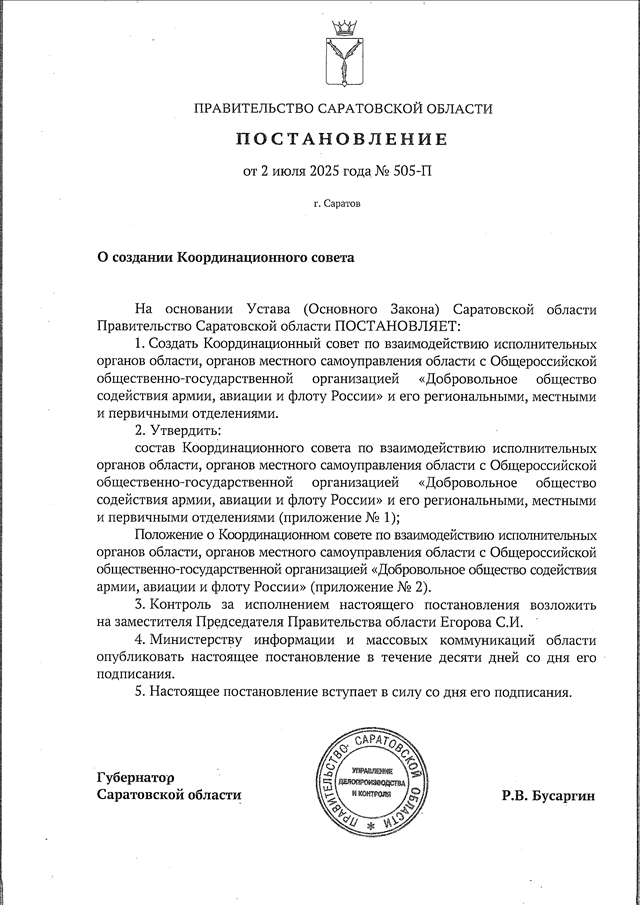 Постановление Правительства Саратовской области от 02.07.2025 N 505-П "О создании Координационного совета" (вместе с "Положением о Координационном совете по взаимодействию исполнительных органов области, органов местного самоуправления области с Общероссийской общественно-государственной организацией "Добровольное общество содействия армии, авиации и флоту России" и его региональными, местными и первичными отделениями")