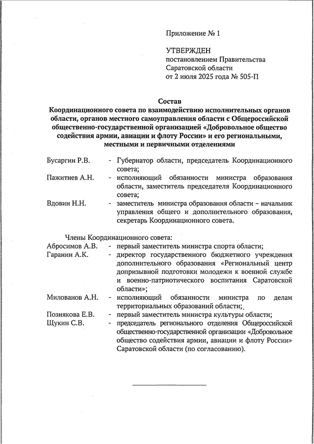 Постановление Правительства Саратовской области от 02.07.2025 N 505-П "О создании Координационного совета" (вместе с "Положением о Координационном совете по взаимодействию исполнительных органов области, органов местного самоуправления области с Общероссийской общественно-государственной организацией "Добровольное общество содействия армии, авиации и флоту России" и его региональными, местными и первичными отделениями")