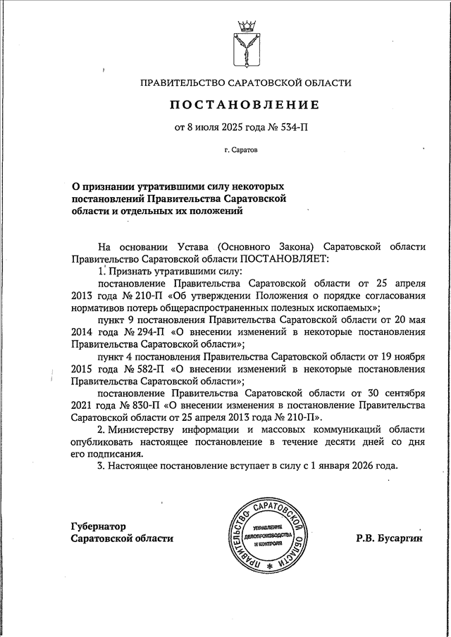 Постановление Правительства Саратовской области от 08.07.2025 N 534-П "О признании утратившими силу некоторых постановлений Правительства Саратовской области и отдельных их положений"