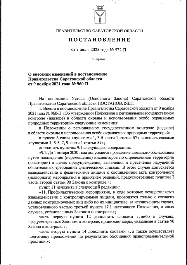 Постановление Правительства Саратовской области от 07.07.2025 N 532-П "О внесении изменений в постановление Правительства Саратовской области от 9 ноября 2021 года N 960-П"