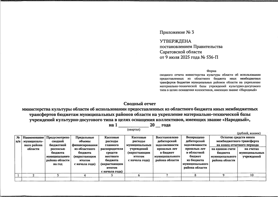 Постановление Правительства Саратовской области от 09.07.2025 N 536-П "О методике распределения и порядке предоставления из областного бюджета иных межбюджетных трансфертов бюджетам муниципальных районов области на укрепление материально-технической базы учреждений культурно-досугового типа в целях оснащения коллективов, имеющих звание "Народный" (вместе с "Положением о методике распределения и порядке предоставления из областного бюджета иных межбюджетных трансфертов бюджетам муниципальных районов области на укрепление материально-технической базы учреждений культурно-досугового типа в целях оснащения коллективов, имеющих звание "Народный")