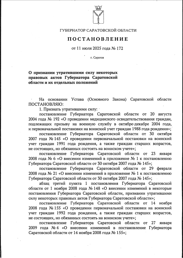 Постановление Губернатора Саратовской области от 11.07.2025 N 172 "О признании утратившими силу некоторых правовых актов Губернатора Саратовской области и их отдельных положений"