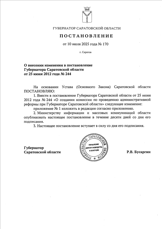 Постановление Губернатора Саратовской области от 10.07.2025 N 170 "О внесении изменения в постановление Губернатора Саратовской области от 25 июня 2012 года N 244"