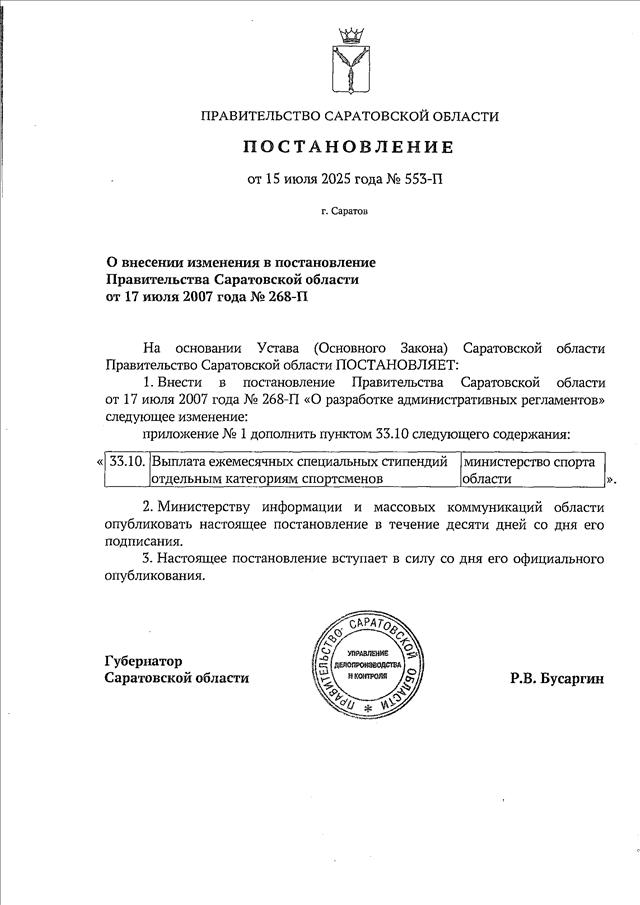 Постановление Правительства Саратовской области от 15.07.2025 N 553-П "О внесении изменения в постановление Правительства Саратовской области от 17 июля 2007 года N 268-П"