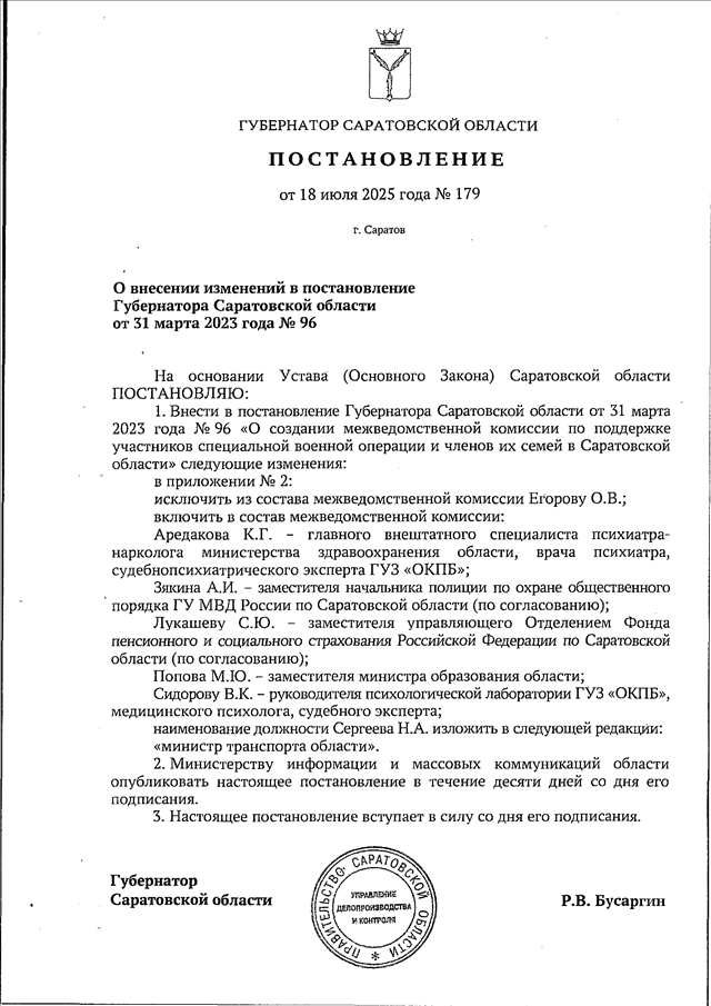Постановление Губернатора Саратовской области от 18.07.2025 N 179 "О внесении изменений в постановление Губернатора Саратовской области от 31 марта 2023 года N 96"