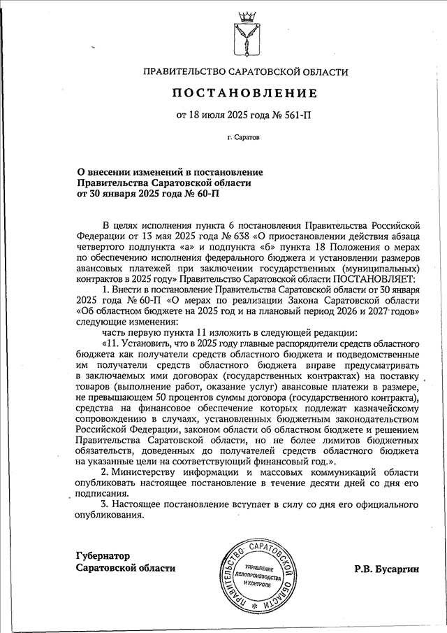 Постановление Правительства Саратовской области от 18.07.2025 N 561-П "О внесении изменений в постановление Правительства Саратовской области от 30 января 2025 года N 60-П"