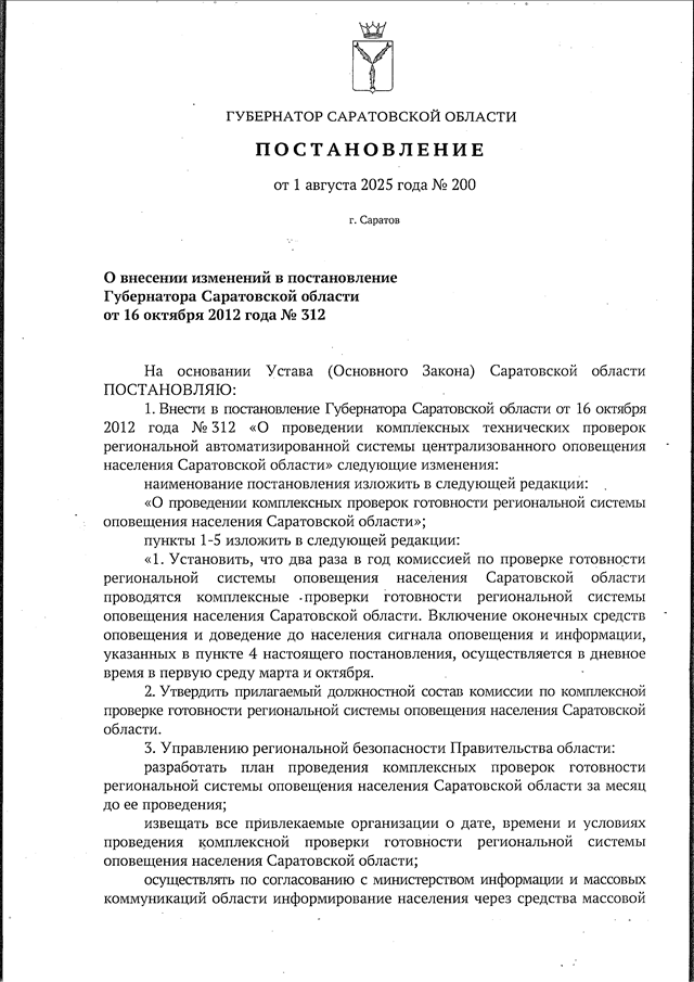 Постановление Губернатора Саратовской области от 01.08.2025 N 200 "О внесении изменений в постановление Губернатора Саратовской области от 16 октября 2012 года N 312"