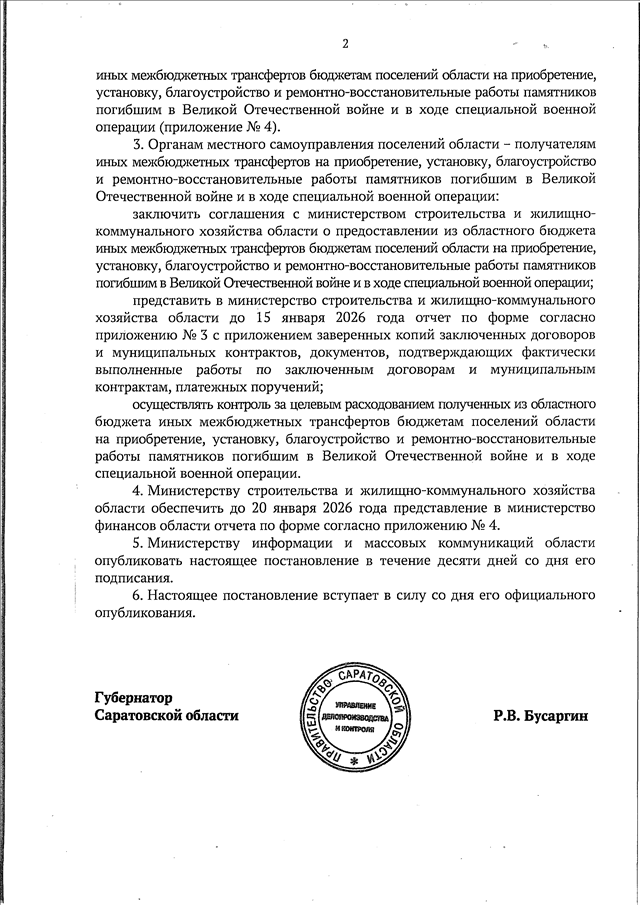 Постановление Правительства Саратовской области от 05.08.2025 N 613-П "О выделении средств из резервного фонда Правительства Саратовской области, методике распределения и порядке предоставления из областного бюджета иных межбюджетных трансфертов бюджетам поселений области на приобретение, установку, благоустройство и ремонтно-восстановительные работы памятников погибшим в Великой Отечественной войне и в ходе специальной военной операции" (вместе с "Положением о методике распределения и порядке предоставления из областного бюджета иных межбюджетных трансфертов бюджетам поселений области на приобретение, установку, благоустройство и ремонтно-восстановительные работы памятников погибшим в Великой Отечественной войне и в ходе специальной военной операции")