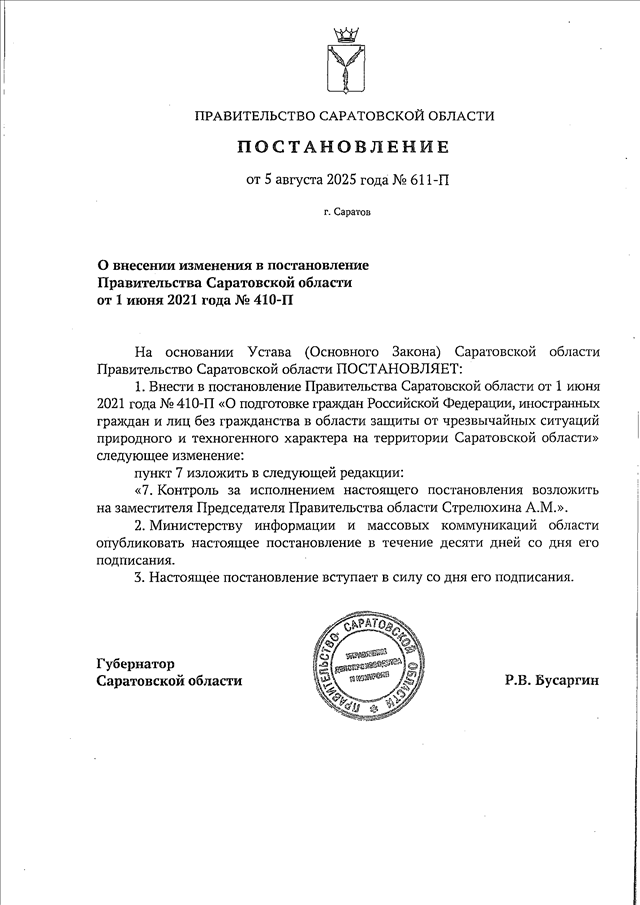 Постановление Правительства Саратовской области от 05.08.2025 N 611-П "О внесении изменения в постановление Правительства Саратовской области от 1 июня 2021 года N 410-П"