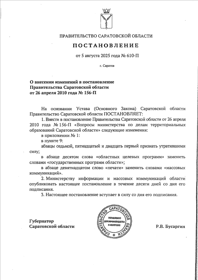 Постановление Правительства Саратовской области от 05.08.2025 N 610-П "О внесении изменений в постановление Правительства Саратовской области от 26 апреля 2010 года N 156-П"