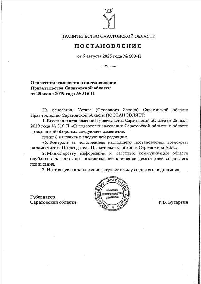Постановление Правительства Саратовской области от 05.08.2025 N 609-П "О внесении изменения в постановление Правительства Саратовской области от 25 июля 2019 года N 516-П"