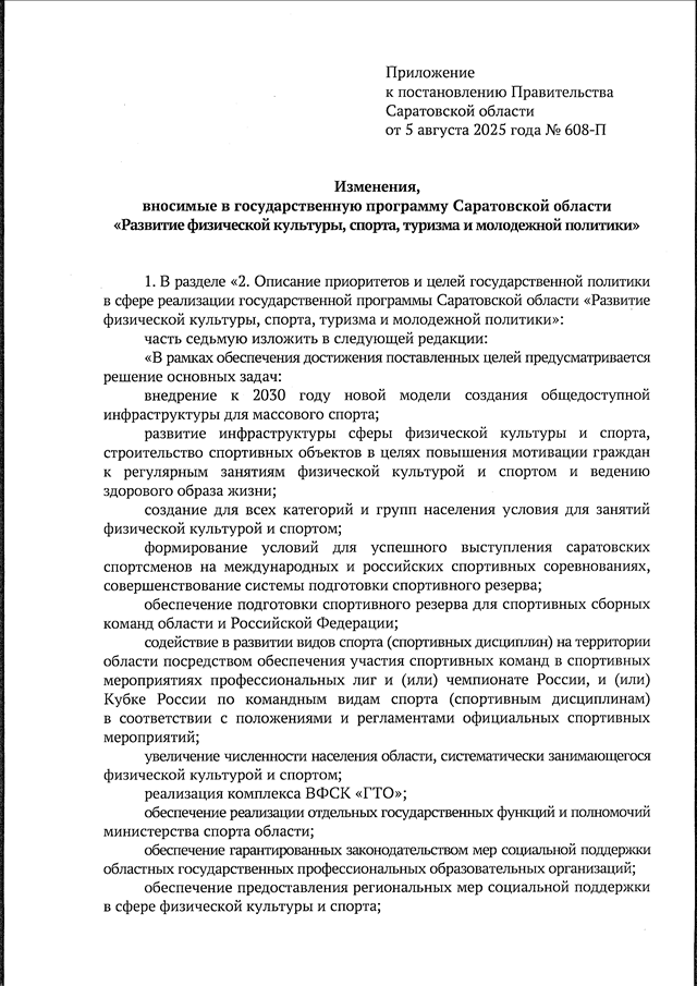 Постановление Правительства Саратовской области от 05.08.2025 N 608-П "О внесении изменений в государственную программу Саратовской области "Развитие физической культуры, спорта, туризма и молодежной политики"