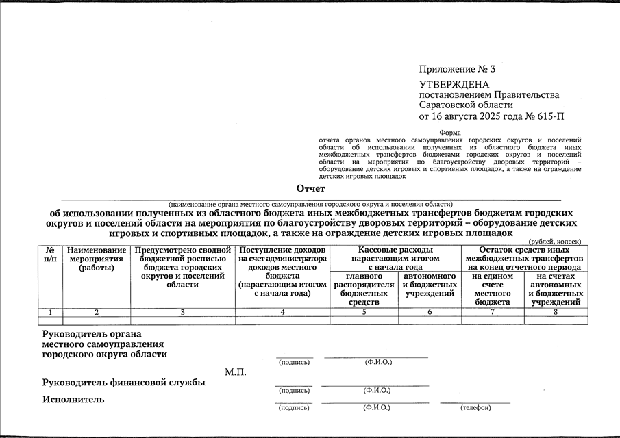 Постановление Правительства Саратовской области от 06.08.2025 N 615-П "О выделении средств из резервного фонда Правительства Саратовской области, методике распределения и порядке предоставления из областного бюджета иных межбюджетных трансфертов бюджетам городских округов и поселений области на мероприятия по благоустройству дворовых территорий - оборудование детских игровых и спортивных площадок, а также на ограждение детских игровых площадок" (вместе с "Положением о методике распределения и порядке предоставления из областного бюджета иных межбюджетных трансфертов бюджетам городских округов и поселений области на мероприятия по благоустройству дворовых территорий - оборудование детских игровых и спортивных площадок, а также на ограждение детских игровых площадок")