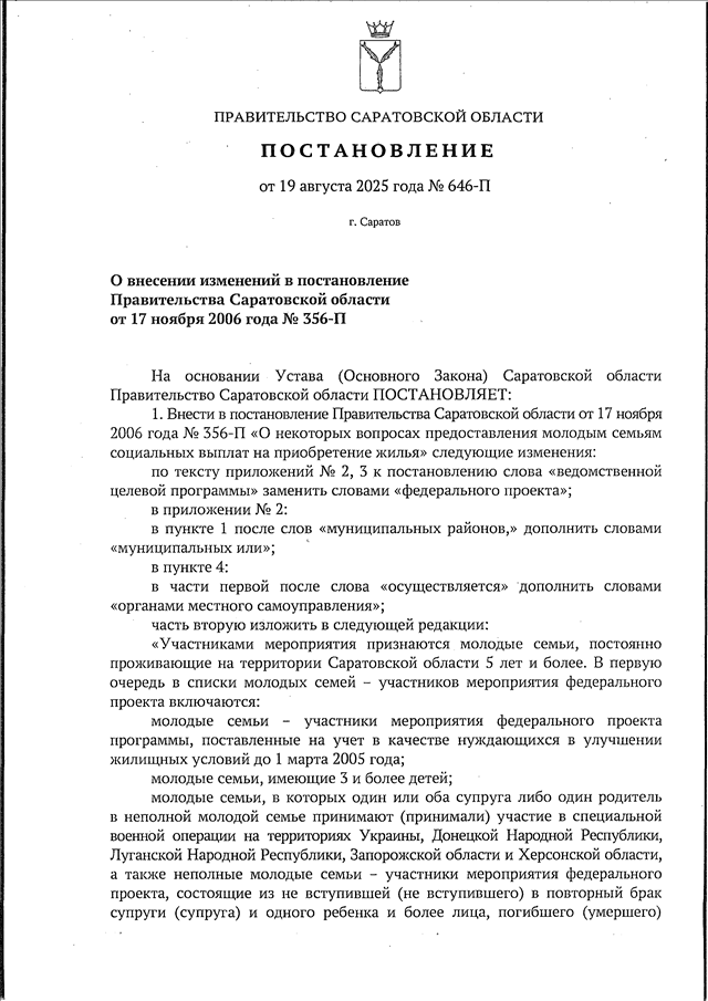 Постановление Правительства Саратовской области от 19.08.2025 N 646-П "О внесении изменений в постановление Правительства Саратовской области от 17 ноября 2006 года N 356-П"