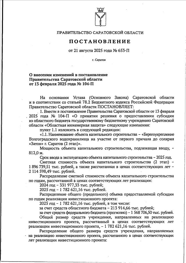 Постановление Правительства Саратовской области от 21.08.2025 N 653-П "О внесении изменений в постановление Правительства Саратовской области от 13 февраля 2025 года N 104-П"