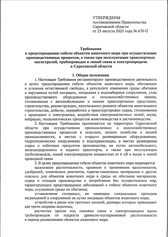 Постановление Правительства Саратовской области от 25.08.2025 N 670-П "Об утверждении Требований к предотвращению гибели объектов животного мира при осуществлении производственных процессов, а также при эксплуатации транспортных магистралей, трубопроводов и линий связи и электропередачи в Саратовской области"