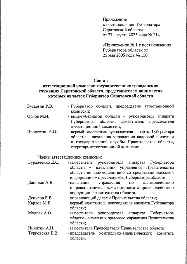 Постановление Губернатора Саратовской области от 27.08.2025 N 214 "О внесении изменения в постановление Губернатора Саратовской области от 25 мая 2005 года N 150"