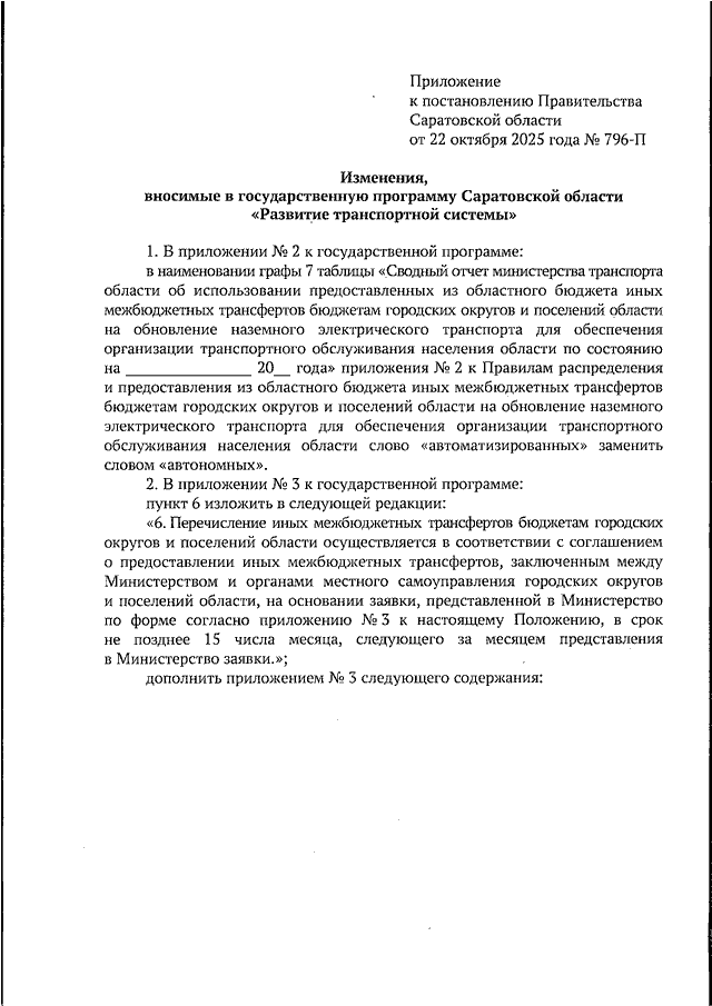 Постановление Правительства Саратовской области от 22.10.2025 N 796-П "О внесении изменений в государственную программу Саратовской области "Развитие транспортной системы"