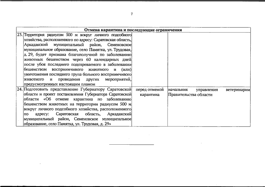 Постановление Губернатора Саратовской области от 30.10.2025 N 268 "Об установлении карантина по заболеванию бешенством животных на территории радиусом 500 м вокруг личного подсобного хозяйства, расположенного по адресу: Саратовская область, Аркадакский муниципальный район, Семеновское муниципальное образование, село Памятка, ул. Трудовая, д. 29"