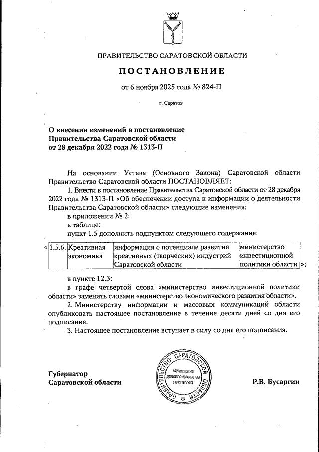 Постановление Правительства Саратовской области от 06.11.2025 N 824-П "О внесении изменений в постановление Правительства Саратовской области от 28 декабря 2022 года N 1313-П"