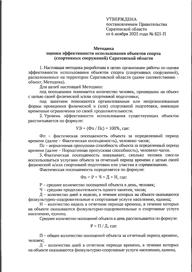 Постановление Правительства Саратовской области от 06.11.2025 N 825-П "О проведении оценки эффективности использования объектов спорта (спортивных сооружений) Саратовской области" (вместе с "Методикой оценки эффективности использования объектов спорта (спортивных сооружений) Саратовской области")