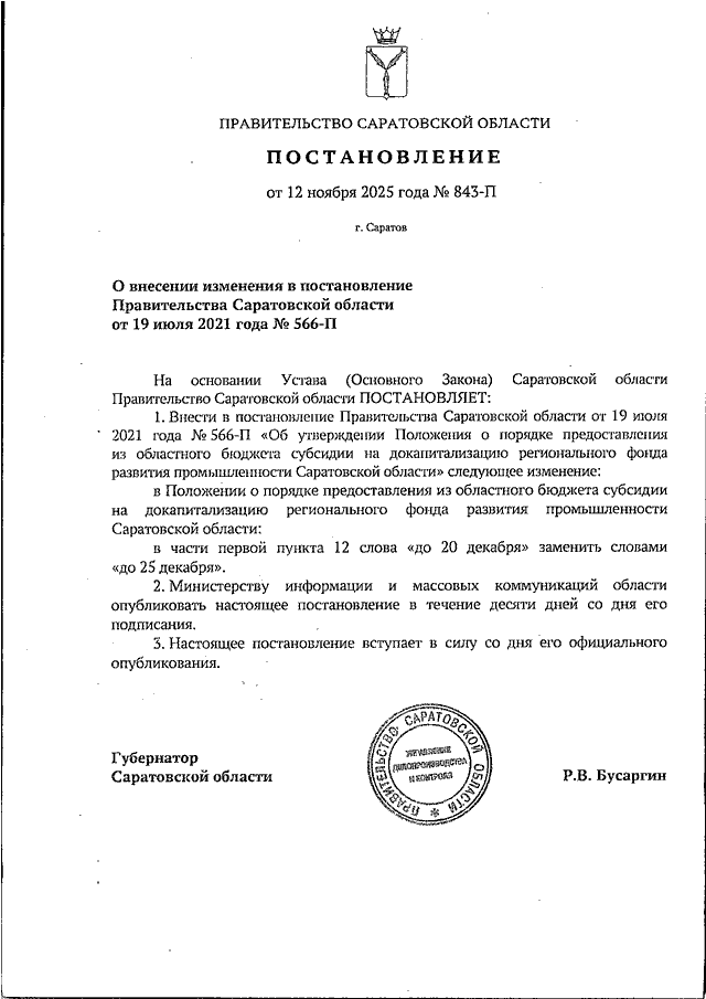 Постановление Правительства Саратовской области от 12.11.2025 N 843-П "О внесении изменения в постановление Правительства Саратовской области от 19 июля 2021 года N 566-П"