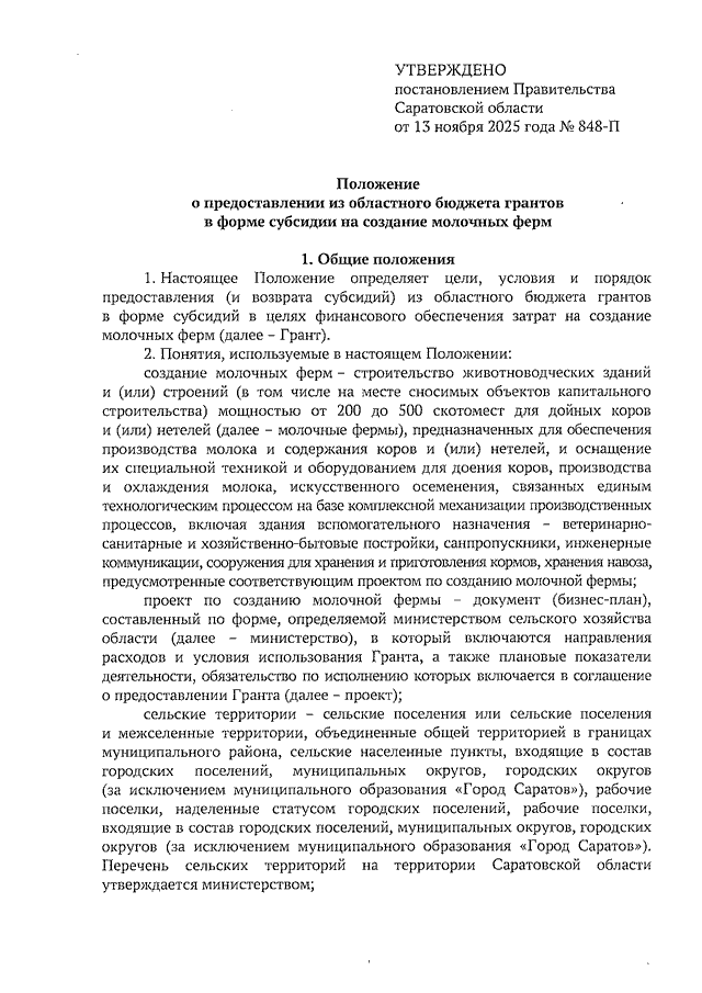 Постановление Правительства Саратовской области от 13.11.2025 N 848-П "Об утверждении Положения о предоставлении из областного бюджета грантов в форме субсидии на создание молочных ферм"