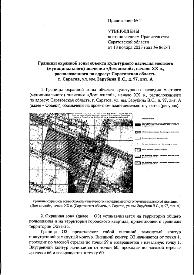 Постановление Правительства Саратовской области от 18.11.2025 N 862-П "Об утверждении зон охраны объекта культурного наследия местного (муниципального) значения "Дом жилой", начало XX в., расположенного по адресу: Саратовская область, г. Саратов, ул. им. Зарубина В.С., д. 97, лит. А" (вместе с "Режимом использования земель и земельных участков и требованиями к градостроительным регламентам в границах охранной зоны объекта культурного наследия местного (муниципального) значения "Дом жилой", начало XX в., расположенного по адресу: Саратовская область, г. Саратов, ул. им. Зарубина В.С., д. 97, лит. А", "Режимом использования земель и земельных участков и требованиями к градостроительным регламентам в границах зоны регулирования застройки и хозяйственной деятельности объекта культурного наследия местного (муниципального) значения "Дом жилой", начало XX в., расположенного по адресу: Саратовская область, г. Саратов, ул. им. Зарубина В.С., д. 97, лит. А")