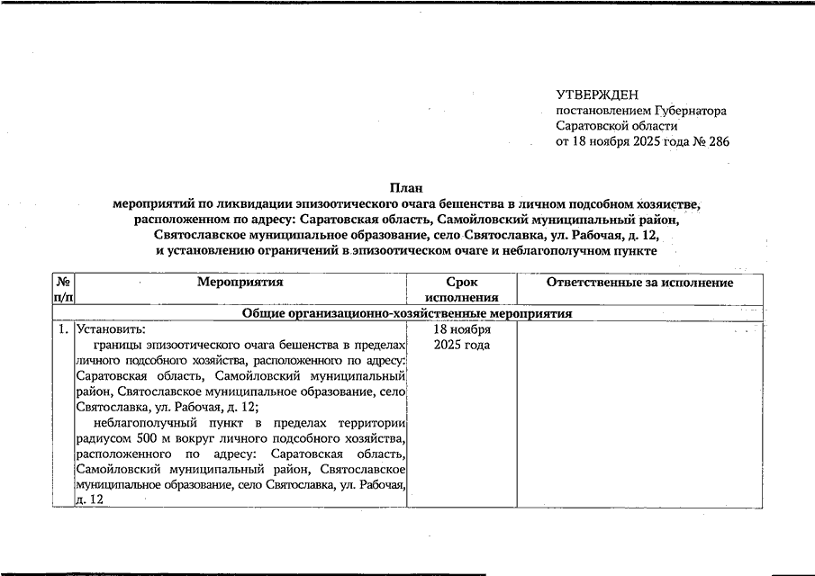 Постановление Губернатора Саратовской области от 18.11.2025 N 286 "Об установлении карантина по заболеванию бешенством животных на территории радиусом 500 м вокруг личного подсобного хозяйства, расположенного по адресу: Саратовская область, Самойловский муниципальный район, Святославское муниципальное образование, село Святославка, ул. Рабочая, д. 12"