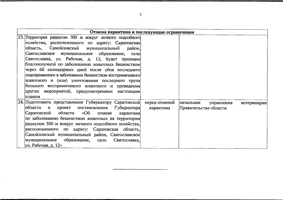 Постановление Губернатора Саратовской области от 18.11.2025 N 286 "Об установлении карантина по заболеванию бешенством животных на территории радиусом 500 м вокруг личного подсобного хозяйства, расположенного по адресу: Саратовская область, Самойловский муниципальный район, Святославское муниципальное образование, село Святославка, ул. Рабочая, д. 12"