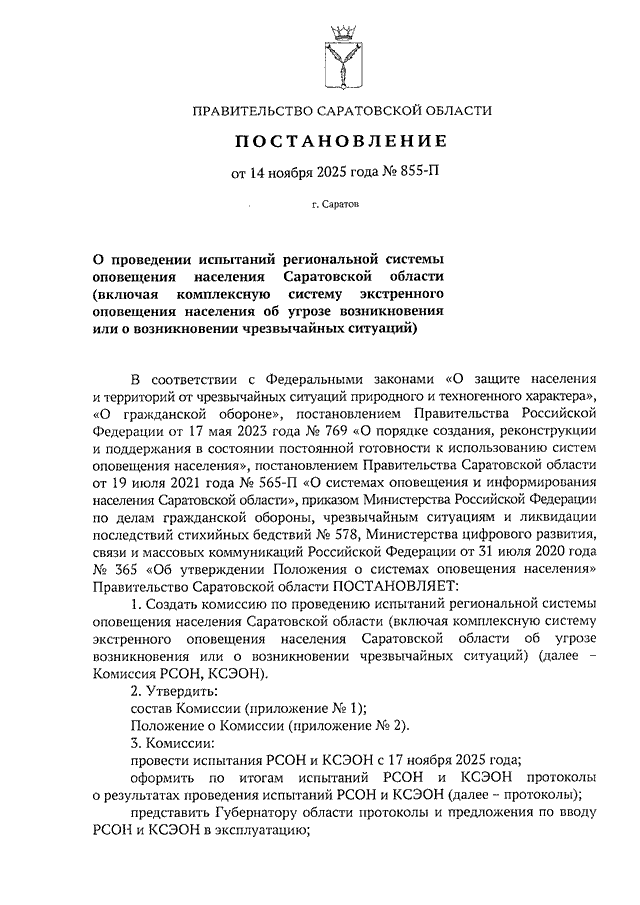 Постановление Правительства Саратовской области от 14.11.2025 N 855-П "О проведении испытаний региональной системы оповещения населения Саратовской области (включая комплексную систему экстренного оповещения населения об угрозе возникновения или о возникновении чрезвычайных ситуаций)" (вместе с "Положением о комиссии по проведению испытаний региональной системы оповещения населения Саратовской области (включая комплексную систему экстренного оповещения населения об угрозе возникновения или о возникновении чрезвычайных ситуаций)")