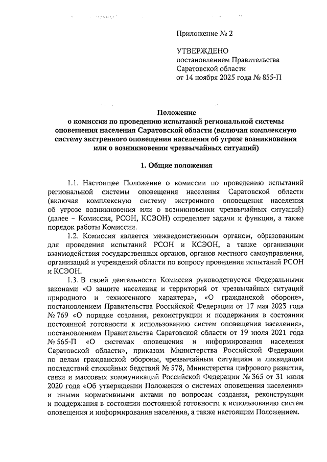 Постановление Правительства Саратовской области от 14.11.2025 N 855-П "О проведении испытаний региональной системы оповещения населения Саратовской области (включая комплексную систему экстренного оповещения населения об угрозе возникновения или о возникновении чрезвычайных ситуаций)" (вместе с "Положением о комиссии по проведению испытаний региональной системы оповещения населения Саратовской области (включая комплексную систему экстренного оповещения населения об угрозе возникновения или о возникновении чрезвычайных ситуаций)")